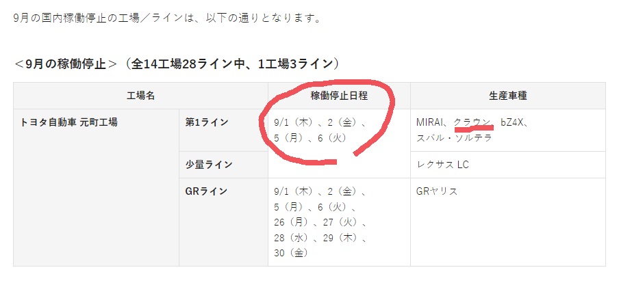 9月、いきなりクラウンに関わる工場の1週間程度の稼働停止は既に決まっていて、生産遅れ、納期遅延に影響があるのは間違いないでしょう。