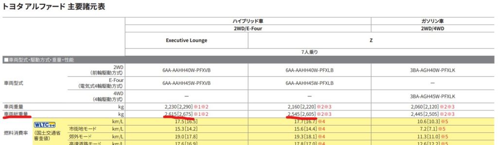 新型アルファード・ヴェルファイアの重量・車両総重量は重い。