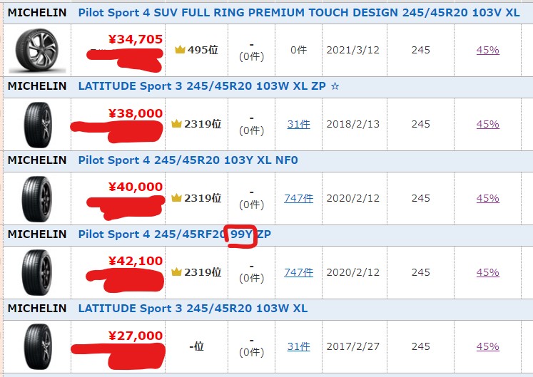 上記の表のミシュランの中でもpilot sport4以外はXL付きなのです。SUV系のライン(重量ある想定)にはXLが付き、つかない99Yロードインデックスのものは乗用車向けのタイヤだと上記のリストで見る人が見ると解るんだそうで。