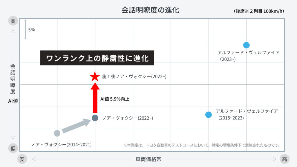 トヨタ的にな言い分としては、100キロ走行時の会話明瞭度が、新型ノア・ヴォクシーでは旧型の30系アルファード・ヴェルファイアレベルまでの静かさに上げてたぜ! というのと、この静音性向上施行で現行の40系アルファードヴェルファイアにあと半分くらい届くくらい静かになったぜ!とPRしています。