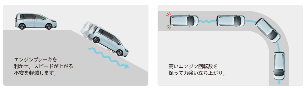 電子制御スロットル (Drive By Wire):アクセルペダルの踏み込み量をセンサーで検知し、その信号をECU(エンジンコントロールユニット)に送り、ECUがスロットルバルブの開度やモーターの出力を適切に制御します。これにより、緻密なエンジン制御や燃費向上を果たしているのですが、そのレスポンスが鈍いと感じることもあるかもしれません。特に山道ですね。あまりそこの加速を求めるのは車のキャラクターとは違ってきますが、もう少しキビキビ走りたいな~って思う時、物足りなさを感じでるでしょう。