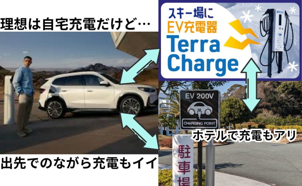 こういう状況だったら使えそう!ってポジティブな面もあり、ホテルやスキー場にもEV充電機は増えて来てて、滑っている間に充電して帰りは満タンに、という使い方も出来るところも増えて来ています。
