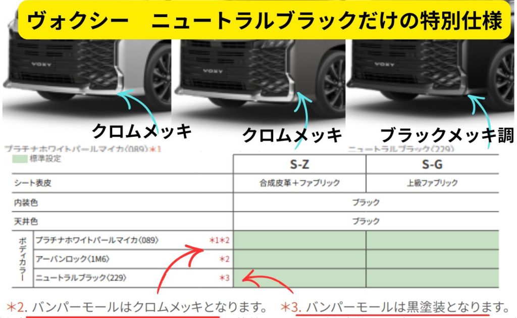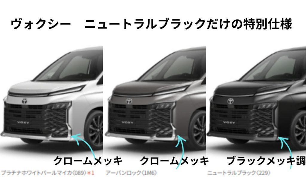 2026年4月ビッグマイナーチェンジ以降のヴォクシーのカタログにも小さくしか載っていないようなんですが、ニュートラルブラックだけ、ライトとバンパー周りの縁取りのモール、メッキからブラックに変更になっていて、特別感が出ているのです。