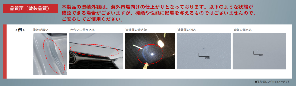 塗装外観は、海外市場向けの仕上がりとなっております。以下のような状態が確認できる場合がございますが、機能や性能に影響を与えるものではございませんので、安心してご使用ください。