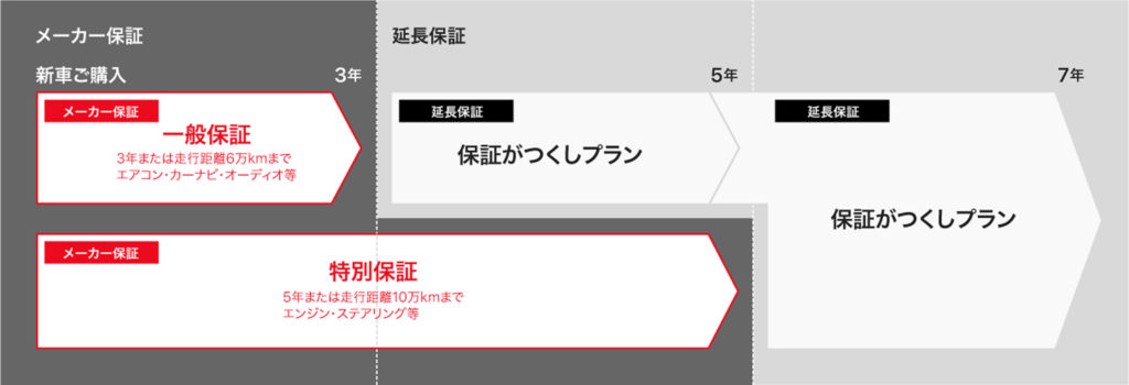 新車登録日から5年間または10万km走行時点のいずれか早い方まで…エンジン機構やステアリング機構、乗員保護装置など、クルマの走行や安全に関わる重要な部品は5年保証です。