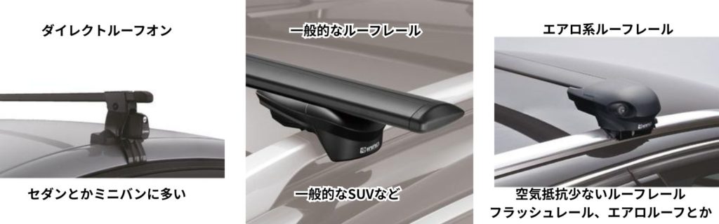 一般的なルーフレール付き車、エアロ系ルーフレール、ルーフレールレス用のベースなど、車両に合わせたベースとバーをセットします。