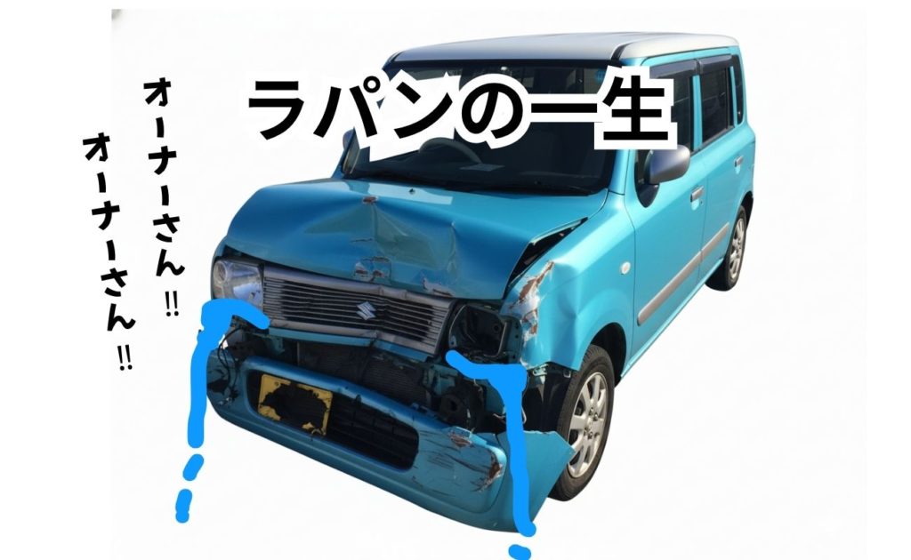このXでのラパンの一生のストーリーのように、事故で修復不可能ともなれば廃車・スクラップになるのは仕方がないところです。