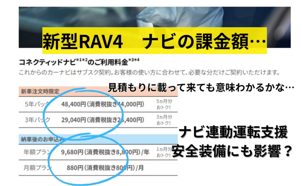 今後はRAV4の見積もり・商談の際には、新車時にナビサブスク契約付けときますね~って5年5万、または3年3万のサブスク契約をシレっと結ぶという事もありそう。