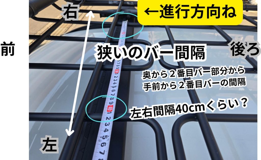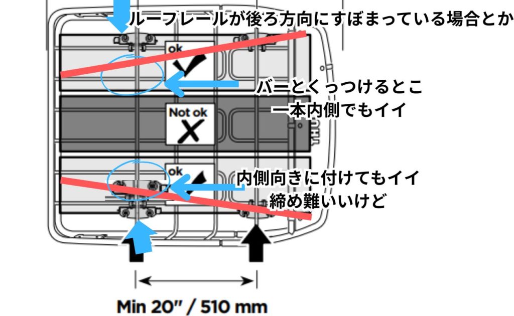 縦軸のバーに取り付けステーを噛ませていくのですが、それがルーフレールやルーフバーと位置がイマイチ合わない時、トリセツの見本の縦バーよりも一本内側のバーに取り付けても良い。