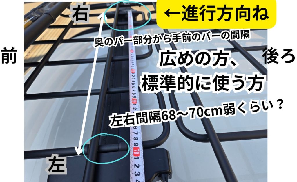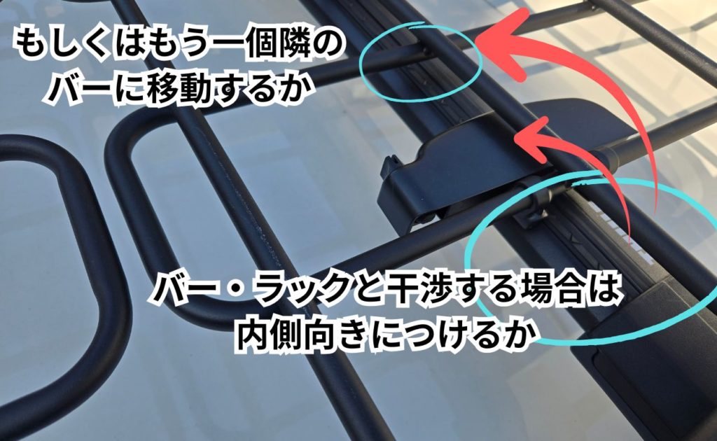 後述する項目でも解説しますが、逆にルーフバーの左右幅が短いものを使う場合等には、取り付け金具やカバーが上手く収まらないので、内向きにつけたり、一個内側のバーの方で固定金具を装着したりと工夫が必要です。