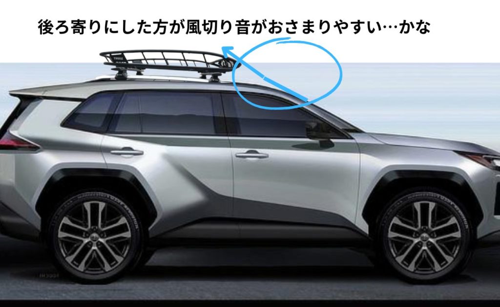 車種によっては取り付け位置がある程度限定されることもありますが、ルーフレールやバーの位置を調整可能であれば、フロントウィンドウの傾斜にそって少し後ろ寄りでリアゲートの開閉で干渉しない程度の場所にセットするのが良いと思います。