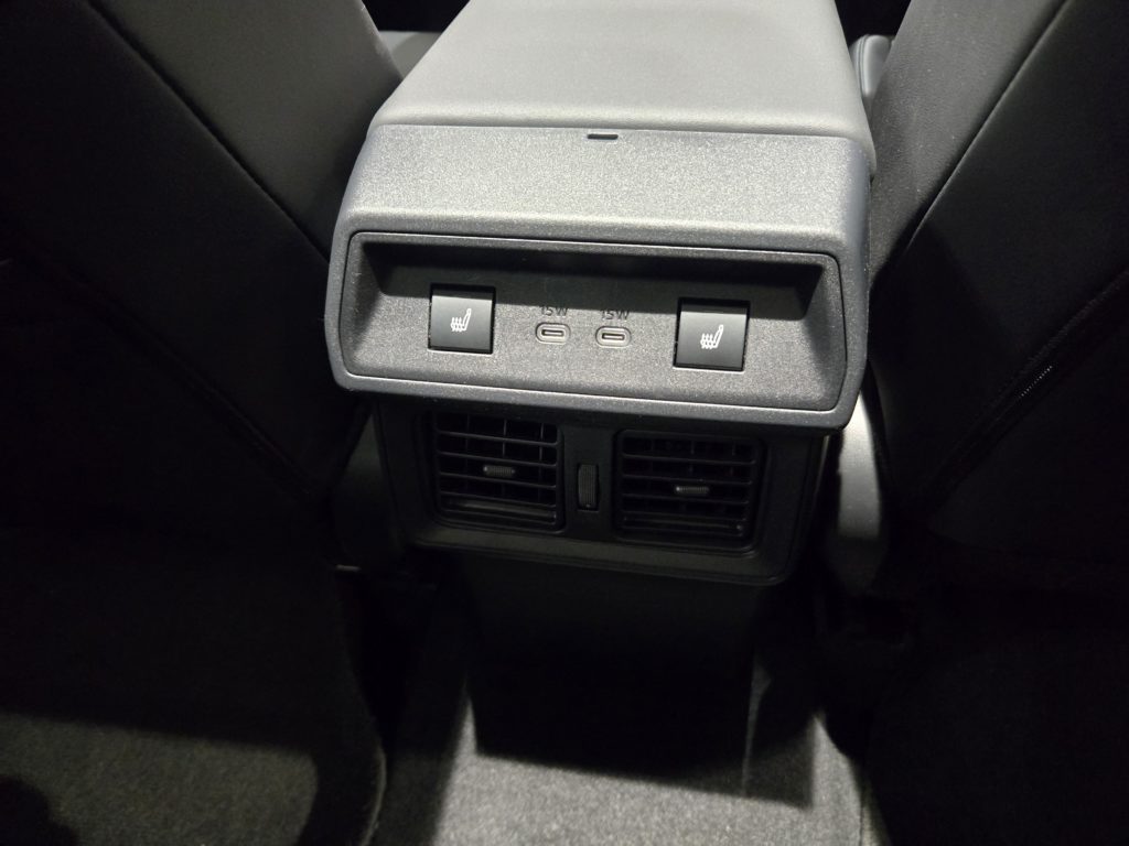 フロントのセンターアームレスト後端にはリアシート用のシートヒーターのスイッチと、USB-Cの給電端子が備わります。