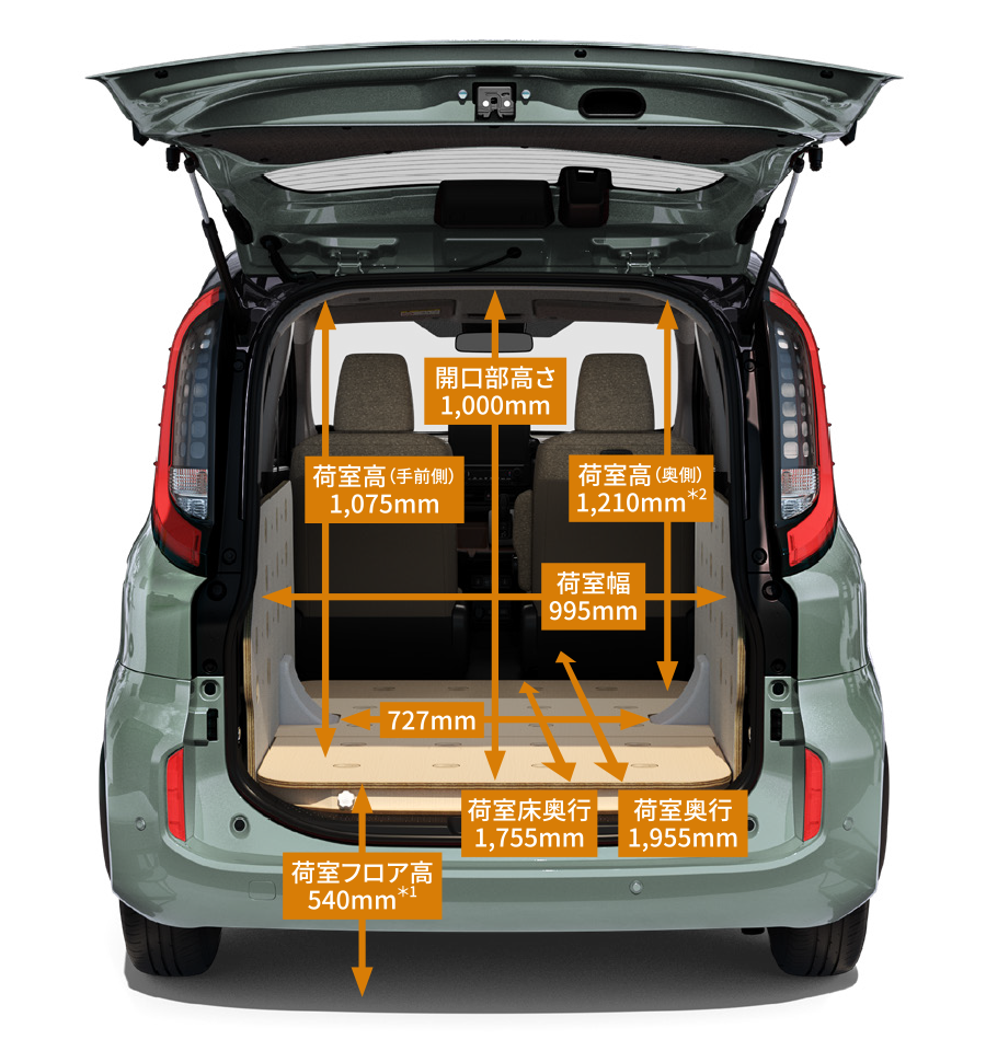 奥行1955㎜や、荷室床実効長さで1755㎜、車中泊でやや足を曲げて寝ることになるかもしれません。大人二人が寝転がるのに厳しいサイドボードを支えるステー部分の荷室幅727㎜もちょっと気になりますね。