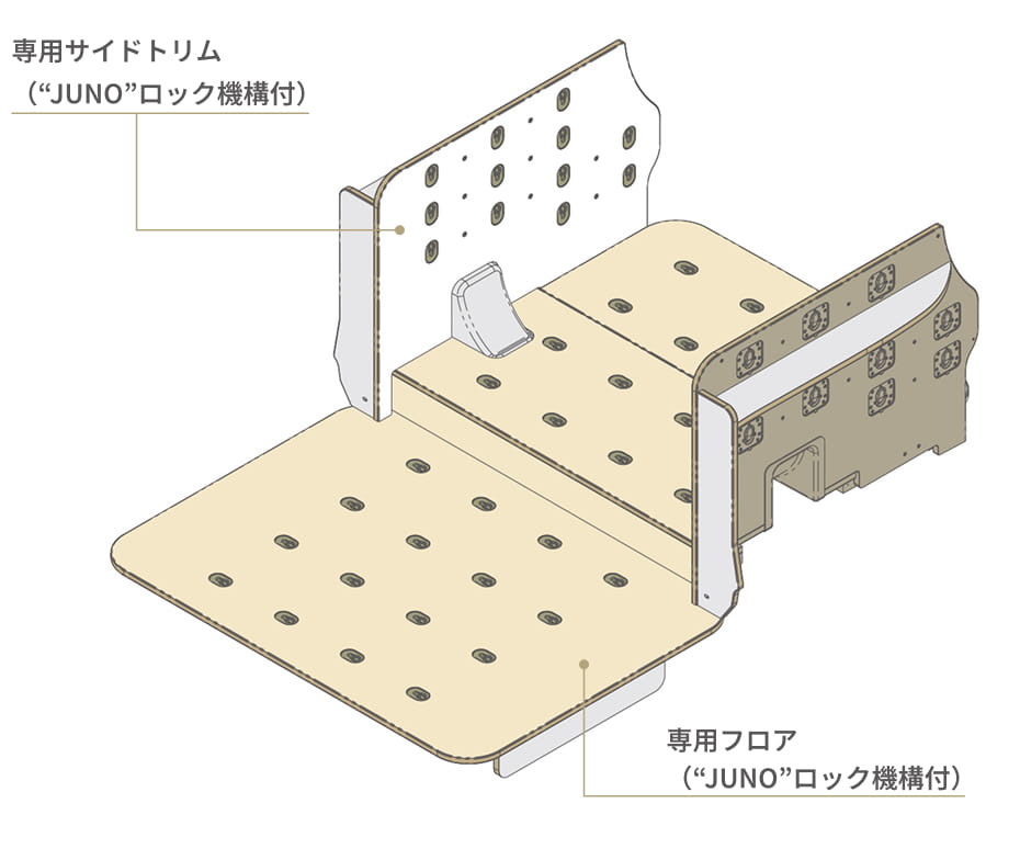 各セットの家具モジュールは、それぞれ単品でも購入可能となっているので、自分だけのJUNOを組み上げることも可能でしょう。最低限の車中泊フルフラットにするボードだけ買って、後はDIYで何とかするとかね。