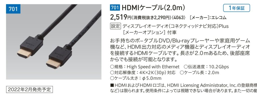 価格は2mで2519円。ディーラーオプション、トヨタモビリティセレクション的な感じでメーカーはエレコムと記載があって1年保証です。