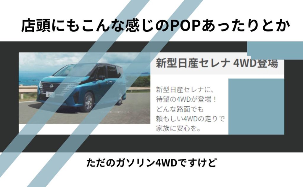 新型セレナは4WDもあります! と謎のPOP・広告系で載ってたりしてるPR。