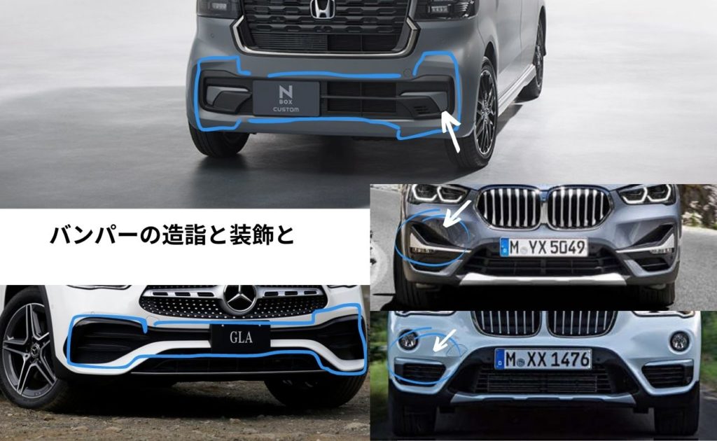 バンパーロアの形状は、MercedesBenz風の開口の取り方を、軽自動車の枠内で直線的にアレンジしたような雰囲気に、そして、装飾のパネルをペッと貼り付けているのはBMWでも一時期そういう装飾をやっていたものに似ている。