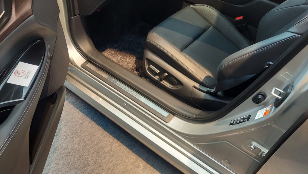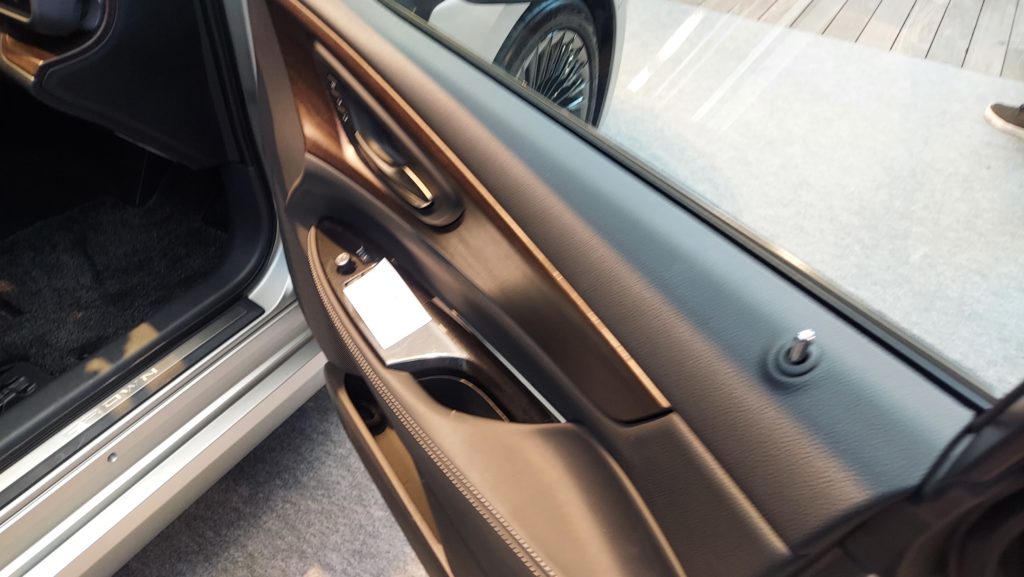 新型クラウンセダン、ドアロックピンがメッキ、杢目のパネルもあり、皮でカバーされているドア周りなどオーソドックスな造詣です。