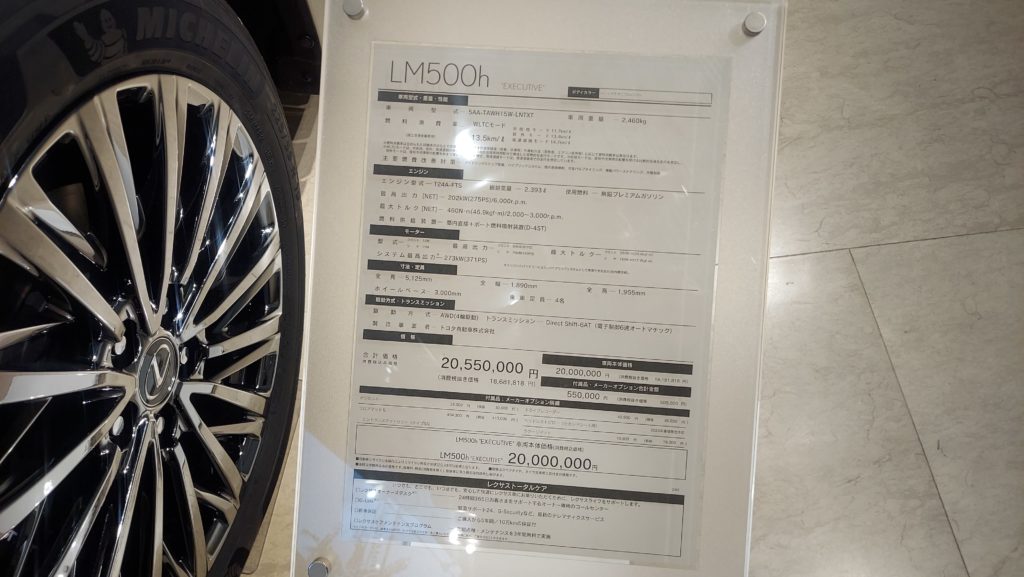 価格は実勢価格700~800万円の新車価格のアルファード・ヴェルファイアに対しての2000万円一本のLM。