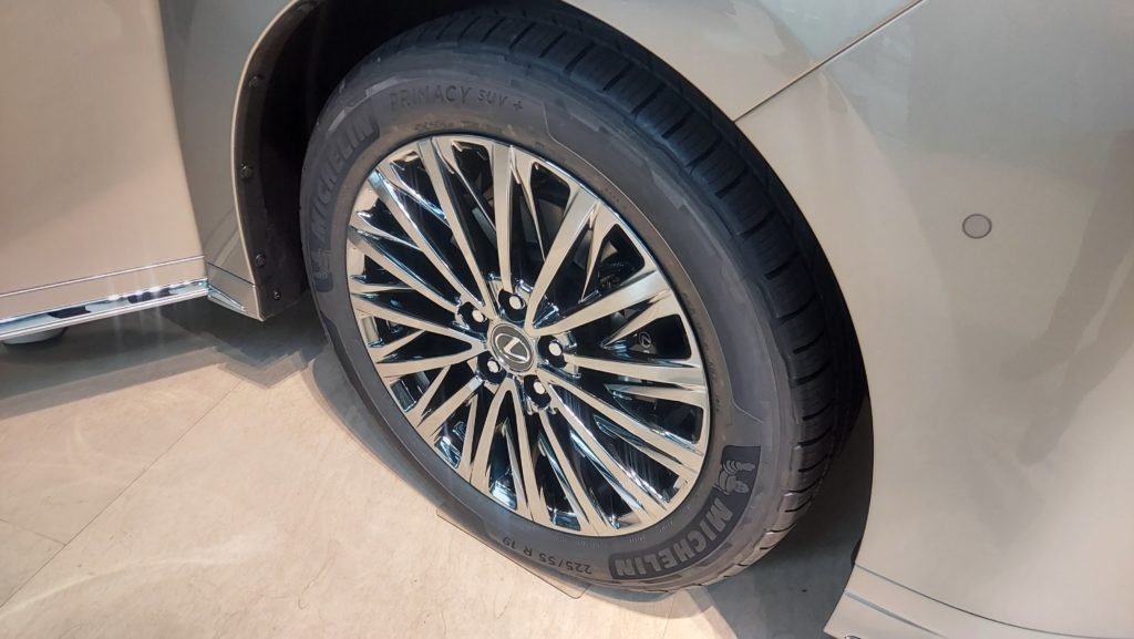 新型レクサスLMの展示車の足もとは19インチのアルミホイールと225/55R19となっています。