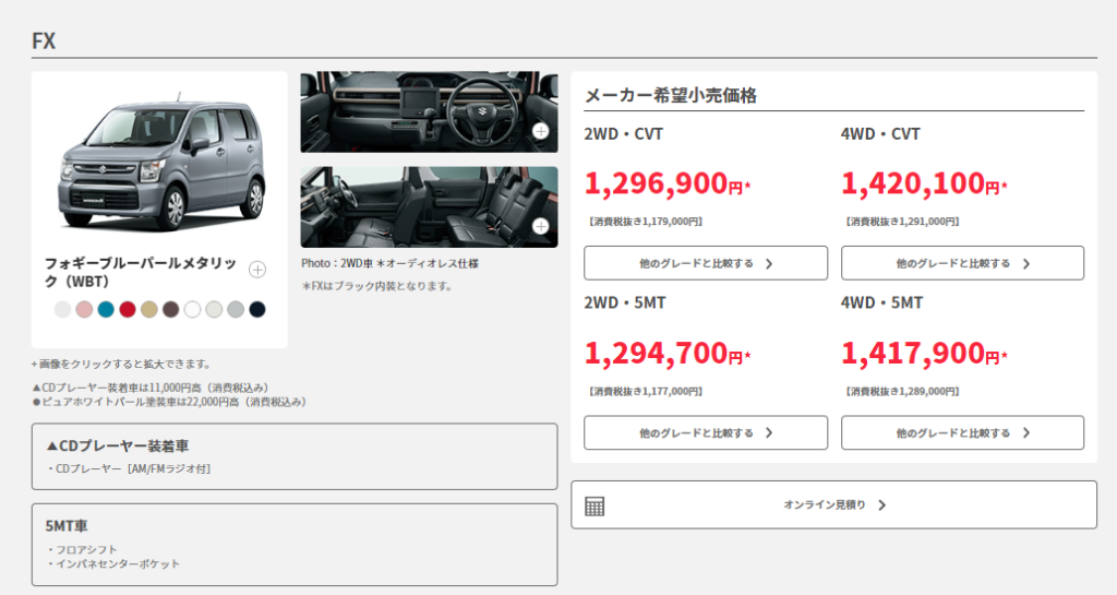 | ワゴンR “FX” | 0.66L DOHC 吸排気VVT | 2WD(FF) | 5MT | 129万4700円 |