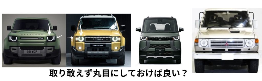 デリカミニもディフェンダーにゴリゴリ寄せた外観デザインで人気だし、ランクルも250系にディーラーオプション(とファーストエディション)で丸目ライト用意しています。
