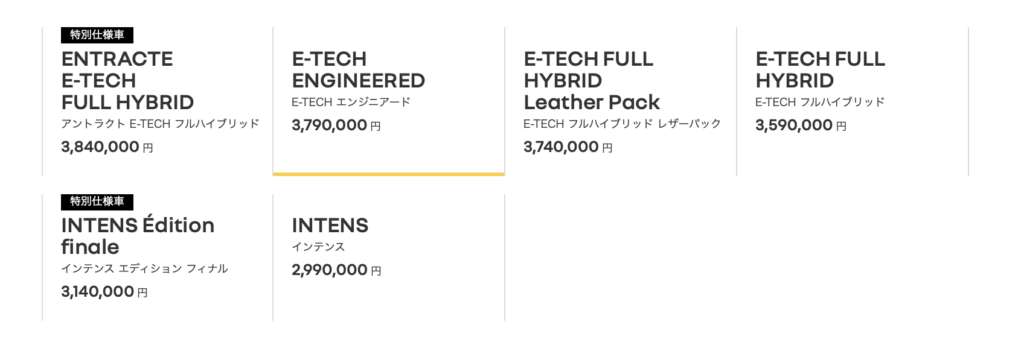 ハッチバックでも300万円の時代か…となるのですが、E-TECHフルハイブリッドでは359万円〜となっています。
