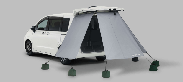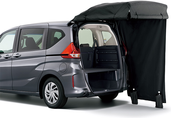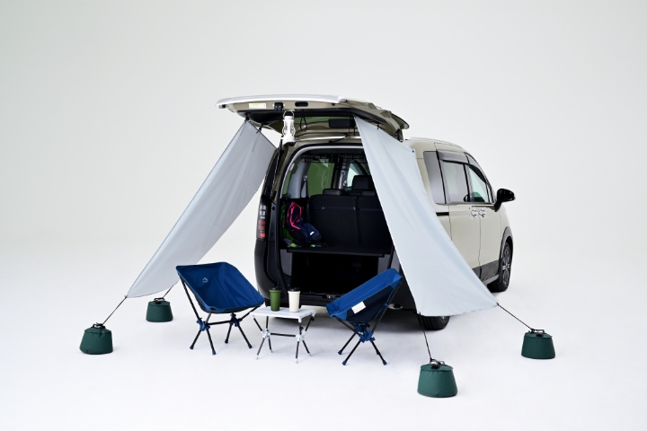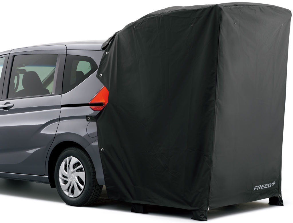 新型フリード用に新設定されたディーラーオプションは、テールゲートタープとなっていて、ラゲッジオープン時の内側にフック・吸盤で取り付ける仕様となっており、短時間で設営可能なタイプへと進化。