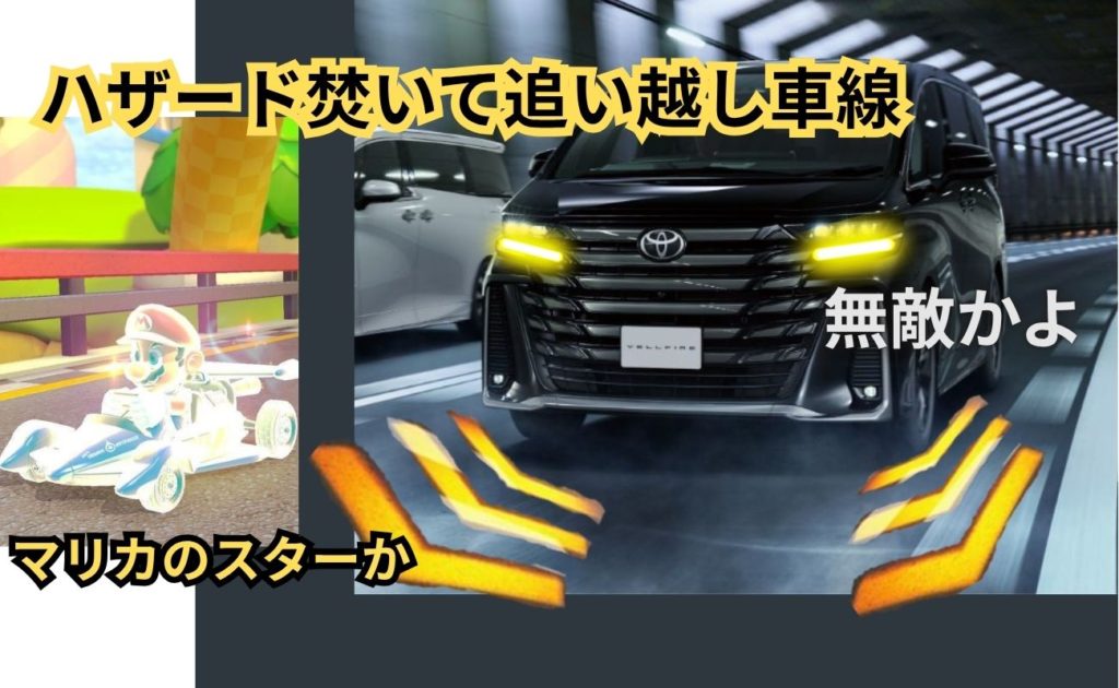 さらにはハザード点灯:点滅している時にも路面を無駄に照らすとかだとそれもヤバいかも。煽り運転追い越し車線ハザード爆走DQNヴェルファイアとか、マリオカートのスター状態かよ!?となるかも。