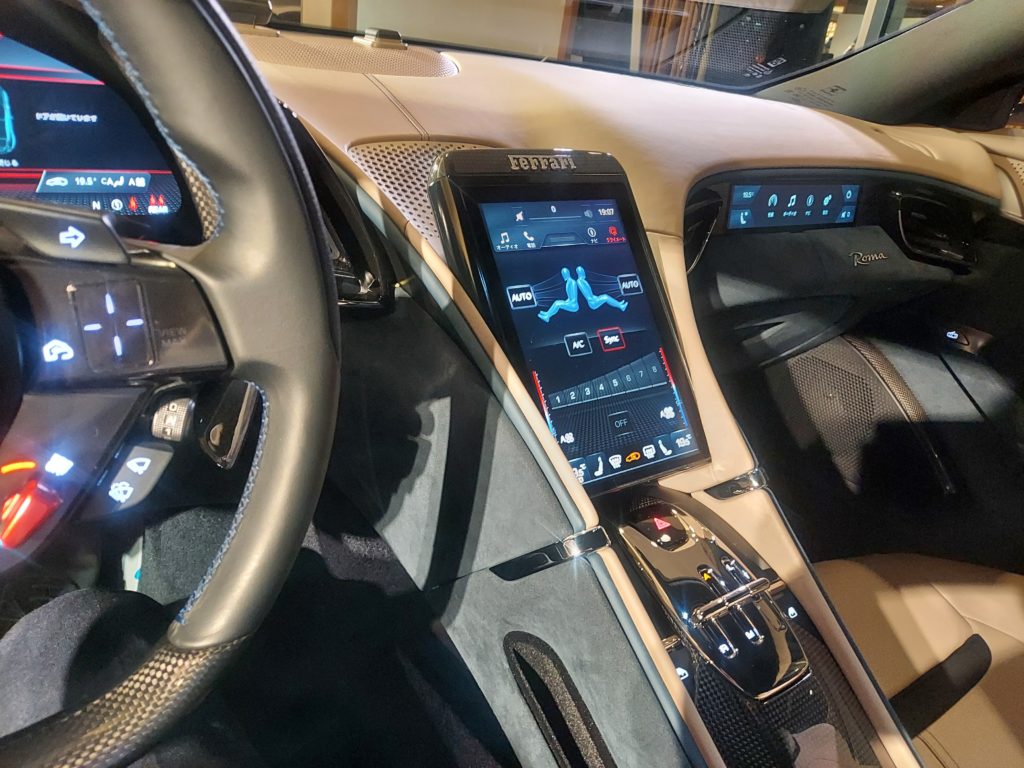タッチ操作が多く、メーター内にナビ表示や、助手席前にもディスプレイ(オプションで100万くらい?)を配するなど先進性でも一歩進んだフェラーリです。