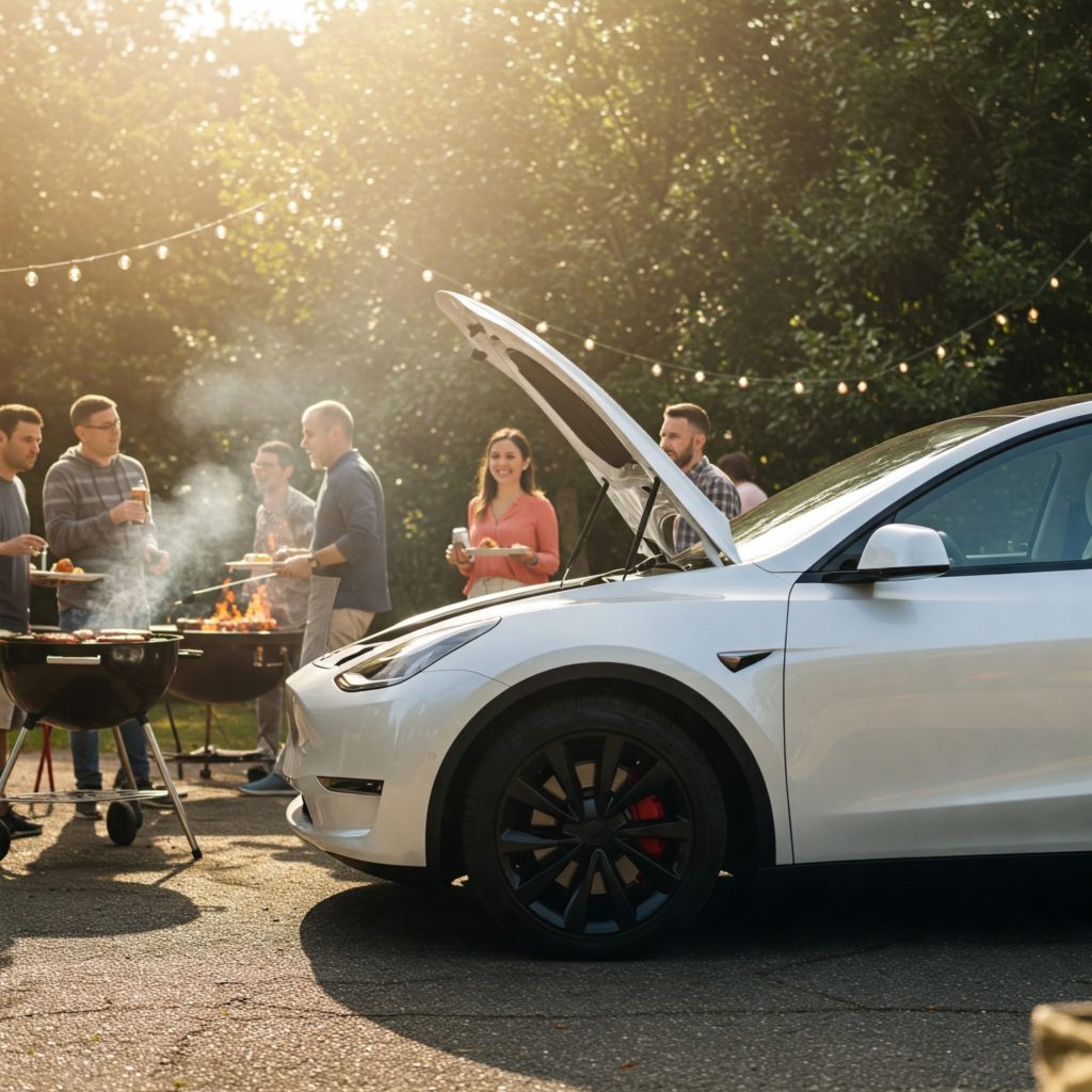車のフランクをクーラーボックス替わりに使うなんてなんてアメリカン! EVなら電源取ってコンパクトな車内冷蔵庫を広いラゲッジに置けよ、なんてヤボなことは言っちゃあいけませんよ。