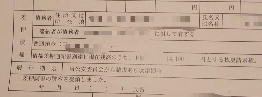 このケースでの財産差し押さえ、金融機関から引き去られたとのこと。