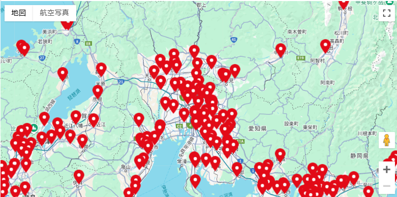 地図をズームイン、ズームアウトすると店舗のピンがぶわーっと出てくるので、要チェックです。