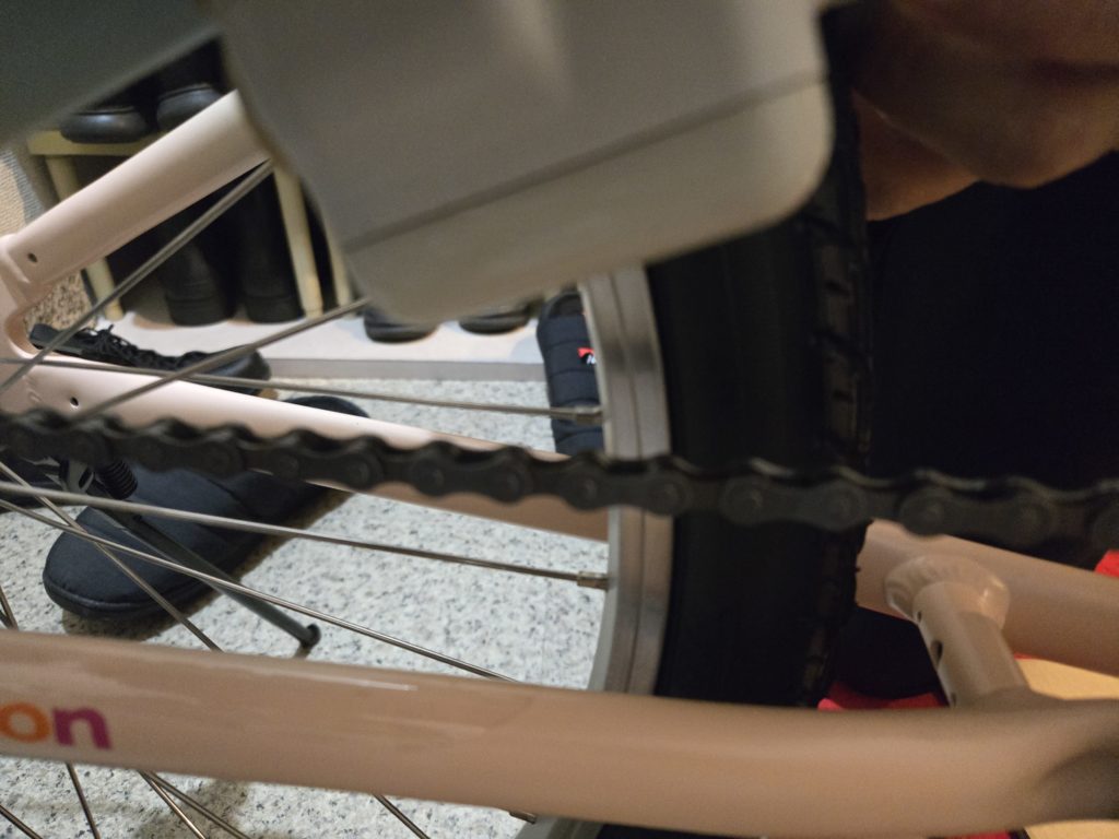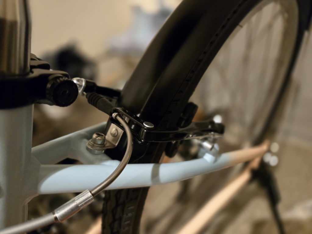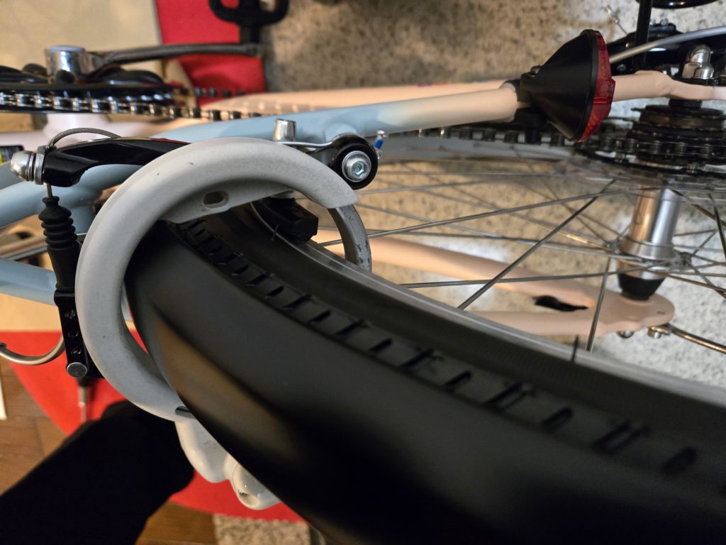 24インチタイヤにVブレーキ、フェンダーをしていても装着は可能な事例として載せておきたいところですが、ポン付けで完璧なフィットではない。
