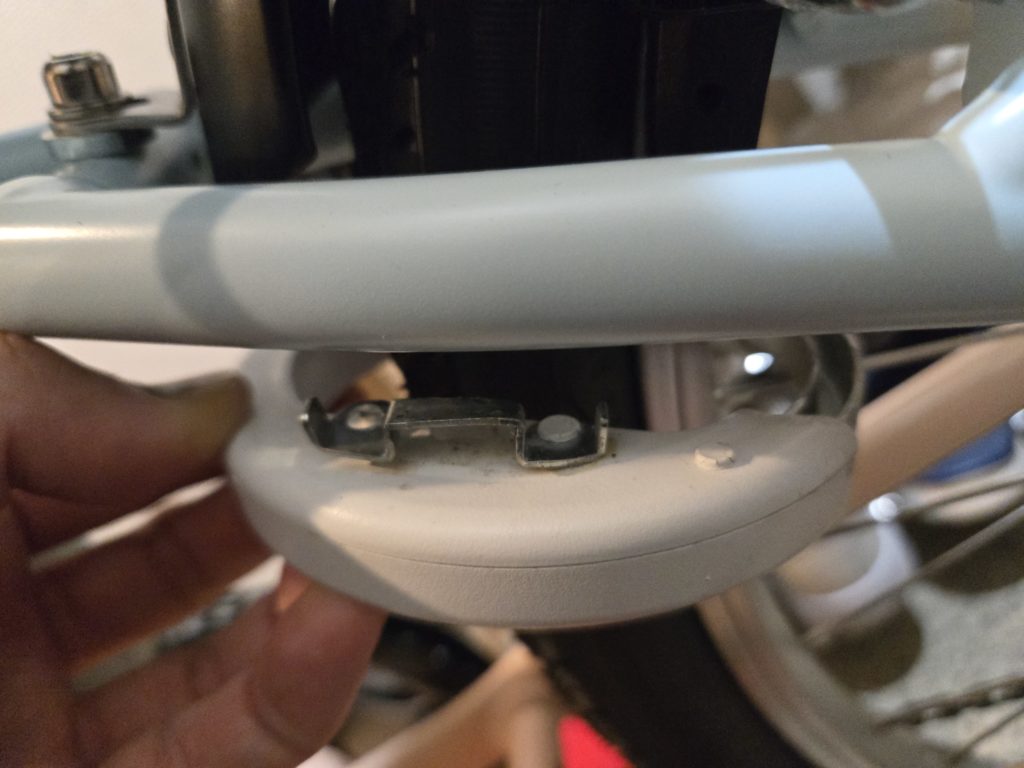 ブレーキに干渉せずに下側に取りまわしてセサミサイクル2をセットすることも可能です。今回はセサミサイクル2側の取り付けステーが損傷して取れてしまったので裏返して付けませんが、こちら向きでの取り付けも可能です。ステーが使えたらコッチ向きの取り付けの方が簡単にも見えます。