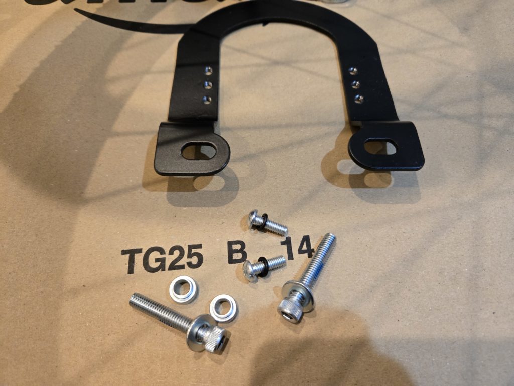 フェンダーとの干渉もあるので、ブラケットの穴は左に寄せて(ブラケットは右に寄せる?)セサミサイクルもかなり寄せてくっ付ける。少し斜めに回し気味のような感じで今回はクリアランス的にはちょうど収まりました。