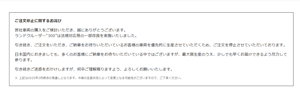 トヨタランドクルーザー300系の改良に合わせて受注停止状況についてのコメントの更新が有りました。