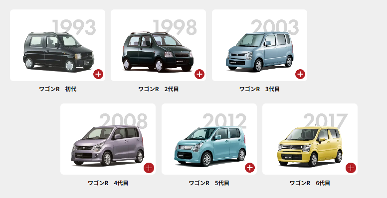 スズキワゴンR公式ホームページでも歴代モデルが載っていたりしますが、これまでは5年おきくらいのリズムでフルチェンジだったのに、2017年の6代目、引っ張り過ぎな気が…