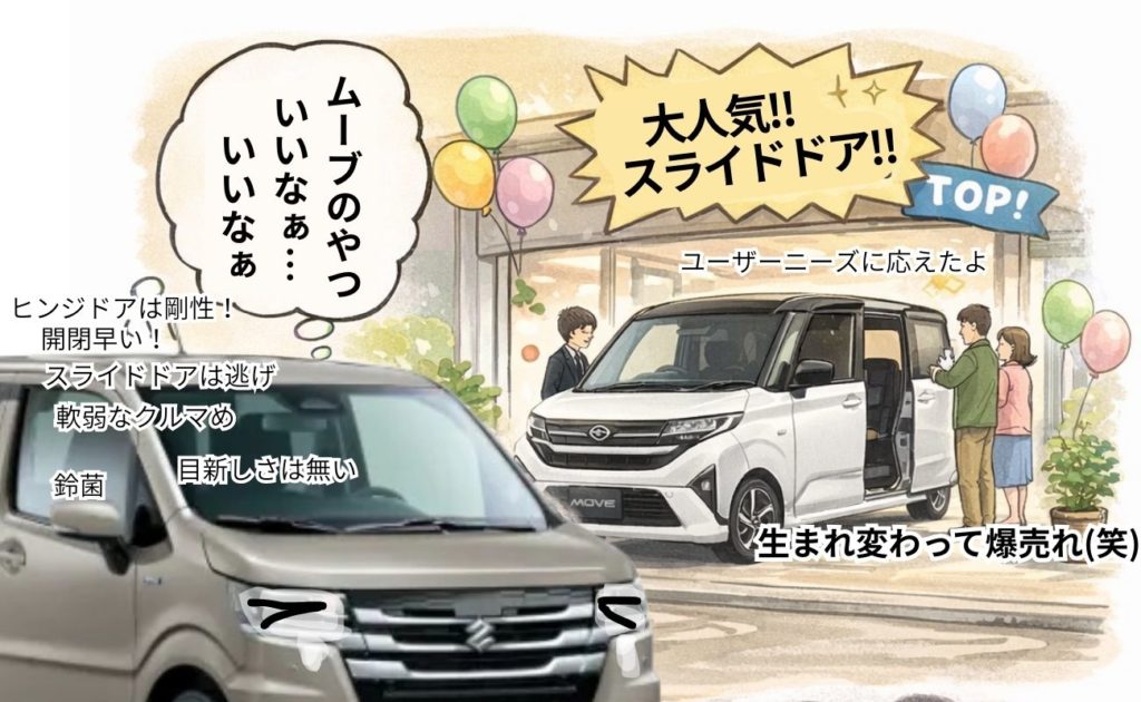 スライドドアへの反骨心、それこそがワゴンRの良さと言いつつも、スライドドア化して売れ行きを伸ばしているダイハツムーブを羨ましく、そして妬ましく思う…