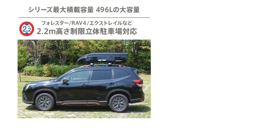 日常使いでも416Lのルーフボックスは優秀、スキー・スノボに繰り出す時には簡単操作で+4cmの高さUPで496Lと最大容量にすることで4~5枚のスキー・スノーボードを積載可能となっています。