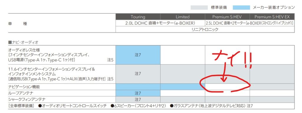 もちろんね、Apple CarPlayとAndroid Auto™などのスマホを繋いでのナビ表示は可能です。車載のメーカー純正ナビが、なぜかPremiumS-HEV無印でだけ選択不可となっているのがポイントで、実質的にS-HEV EXをナビとアイサイトX付のパッケージオプション装着車くらいに理解しておくのが大事です。