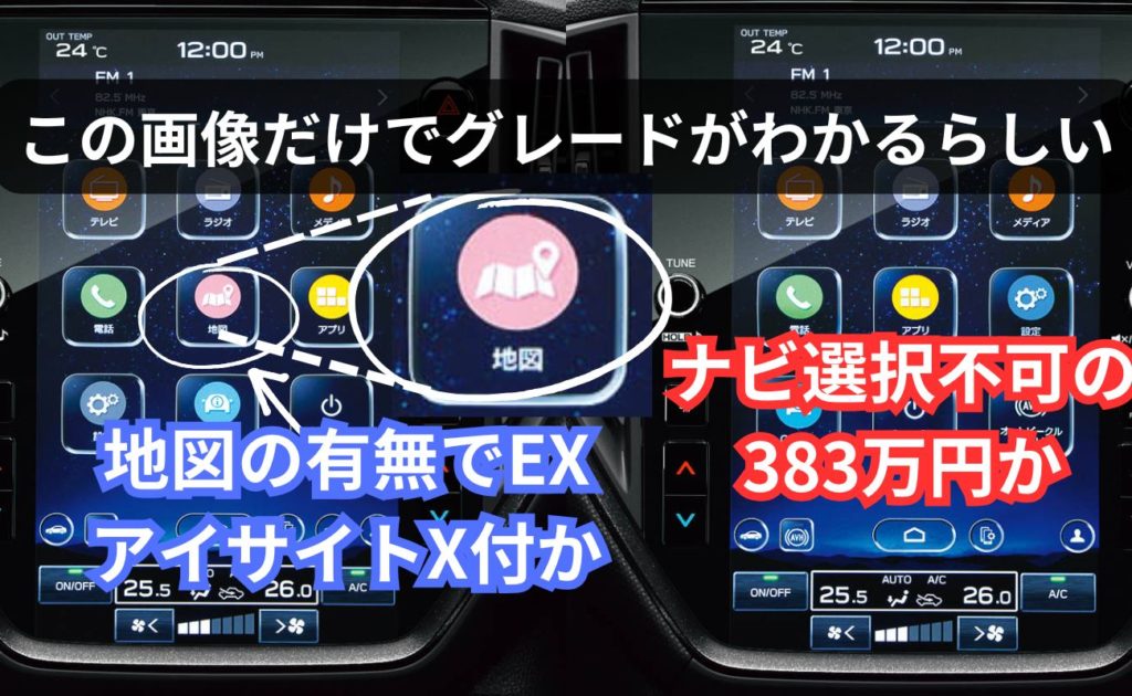 これは、ナビだけで8.8万円のMOPで用意するとそれだけでイイやって感じにさせないためのチカラ技みたいなもの。アイサイトXは18.7万円の抱き合わせとなります。