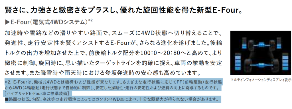 E-Fourは、機械式4WDとは機構および性能が異なります。さまざまな走行状態に応じてFF(前輪駆動)走行状態 から4WD(4輪駆動)走行状態まで自動的に制御し、安定した操縦性・走行の安定性および燃費の向上に寄与するものです。 ■路面の状況、勾配、高速等の走行環境によってはガソリン4WD車に比べ、十分な駆動力が得られない場合があります。との注釈が付いていました。