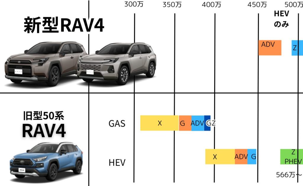 50系旧型RAV4、ガソリンモデルは新車価格300万円台半ばから~となっていて