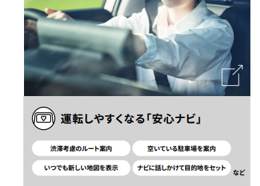 渋滞考慮ルート、駐車場の満空情報、地図を最新化、音声操作、これらの機能を打ち出しているものの、これまでのナビで出来ることのようにも思えるし、スマホのグーグルマップでも同じように最新情報を反映されてるし。。。