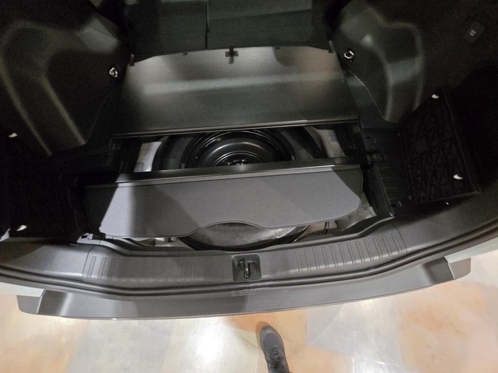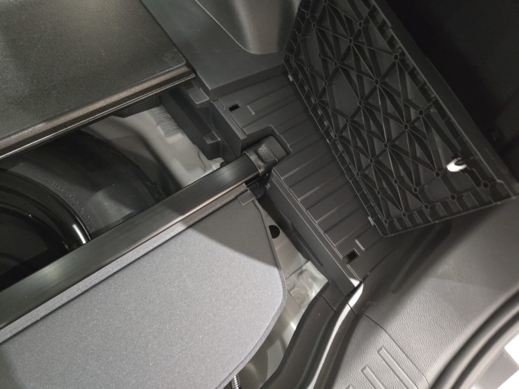 スペアタイヤは車体の外側に吊るしているのではなく、車内ラゲッジスペースの下側に収めてあります。