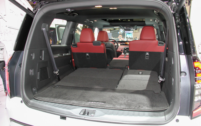 日産新型パトロールは5mを超える全長に、2mを超える全幅、3mを超えるホイールベースというゆとりのある体躯を活かし、3列シート車としています。