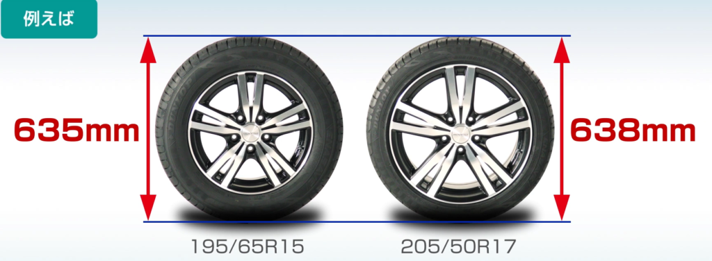例えば、標準が17インチの車を17インチや15インチにするイメージです。スピードメーターに狂いが出ないよう、外径を維持するのが鉄則です。