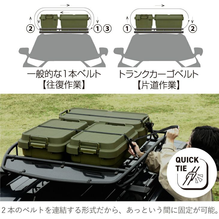 キャリアベルト自体の接続時の長さは2.4m程度までの許容があって、大きめのボックス2個〜3個を跨いで固定して余裕のなる長さに設定されているのもいい。箱二個を固定した時などベルトが長めに余っても長すぎずまとめやすいのよね。