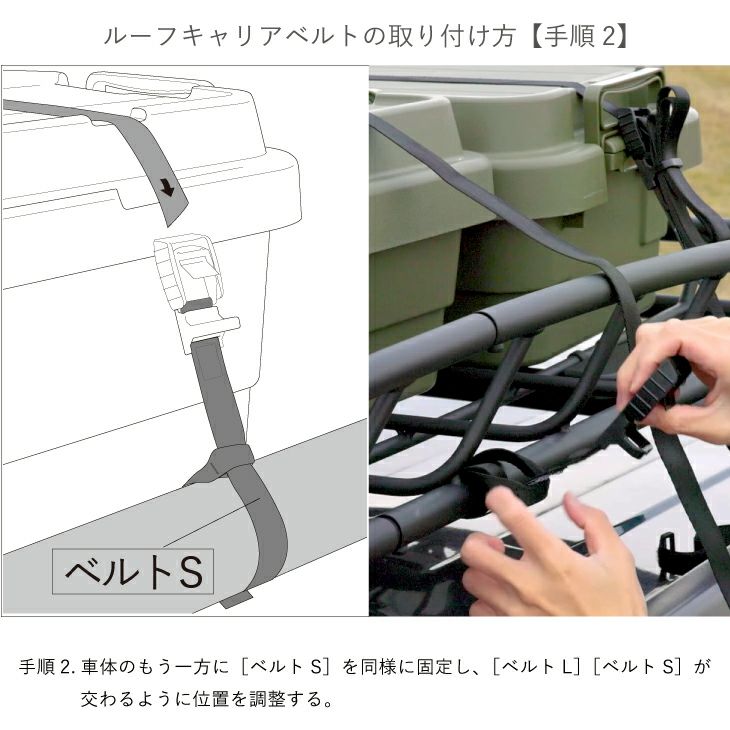 運転席側・助手席側どちらをL(長い方)にして荷物の上を通すかは、積載する環境によりけりです。個人的には運転席の上がベルトS、短い方のバックルがある方がいいかな〜と思います。SA・PAでの休憩の際にバックルの緩み、ベルトの状態などをチェックしやすいかなと思うからです。